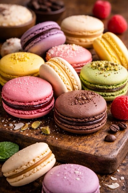 They’re crisp on the outside, chewy inside, and filled with ganache, jam, or buttercream. The base is made from almond flour, egg whites, and sugar. And yes, they’re piped individually before baking.