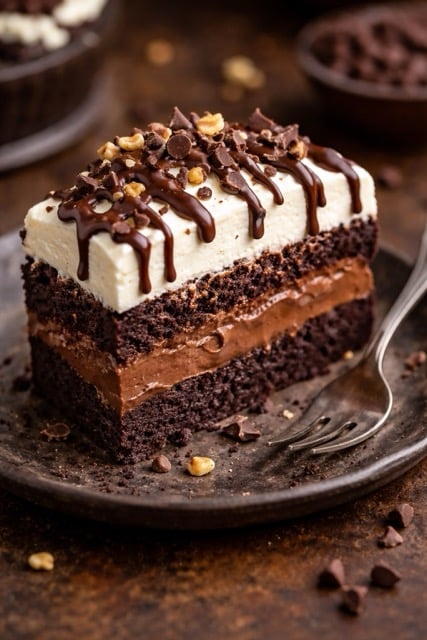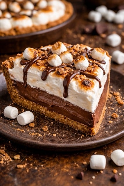 The Mississippi Mud Pie is pure chocolate overload. It consists of a chocolate cookie crust, a moist, fudgy brownie, and a rich chocolate filling. And, depending on the recipe, it can have fresh whipped cream or sweet, melted marshmallows on top.