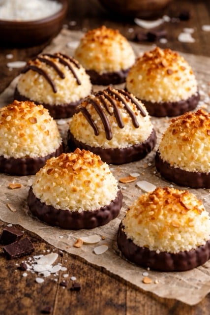 Made by combining sugar, egg whites, and flaked coconut, the Macaroons are proof that complex ingredients are not necessary to produce a delectable dessert. They are sweet, chewy, and often covered in chocolate.