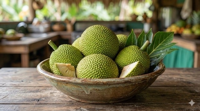 When cooked, breadfruit has a starchy texture similar to potatoes and a slightly sweet flavor that works in both savory and sweet dishes. The fruit grows to the size of a small watermelon and has a bumpy green skin that turns yellowish when ripe.